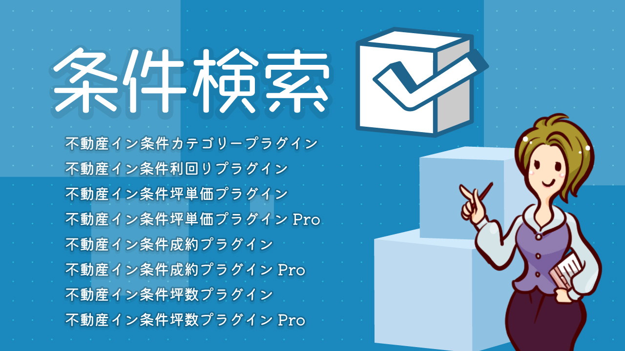 不動産プラグイン(Pro)の標準機能である条件検索を拡張し、カテゴリー/利回り/校区/町名などの条件を追加する製品です。